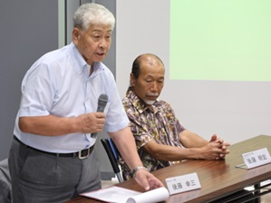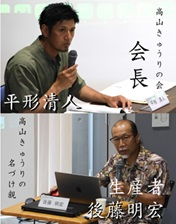 多数の報道等関係者の前で、高山きゅうりの栽培及びGI登録に至るまでの経緯につ いて説明する「高山きゅうりの会」の会長・平形氏と高山きゅうりの名づけ親である 生産者・後藤氏、2名の左に安東局長