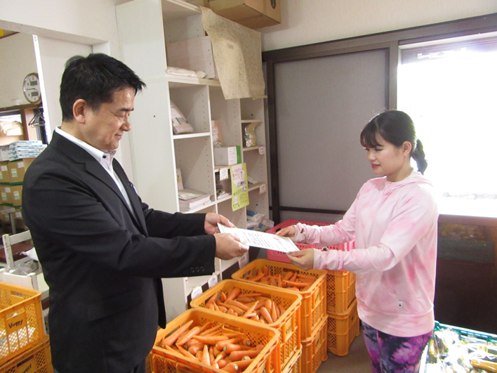 令和7年5月29日に株式会社ビオベジの農産物販売所において、小田地方参事官から鈴木代表取締役へ認定証の授与を行いました。