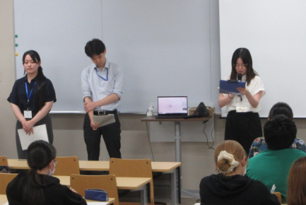 続いて、入省して数年の若手職員3名(関東農政局生産部2名、群馬県拠点1名)から、農林水産省入省の動機や現在配属されている部署の紹介、関東農政局で働いて思うこと(職場環境や雰囲気)について、参加した学生に向け説明が行われました。