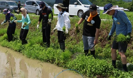 | 青空縁農隊の面々が、夏の青空の下、機械植えのあとを手分けして苗の捕植をおこなっています | ||