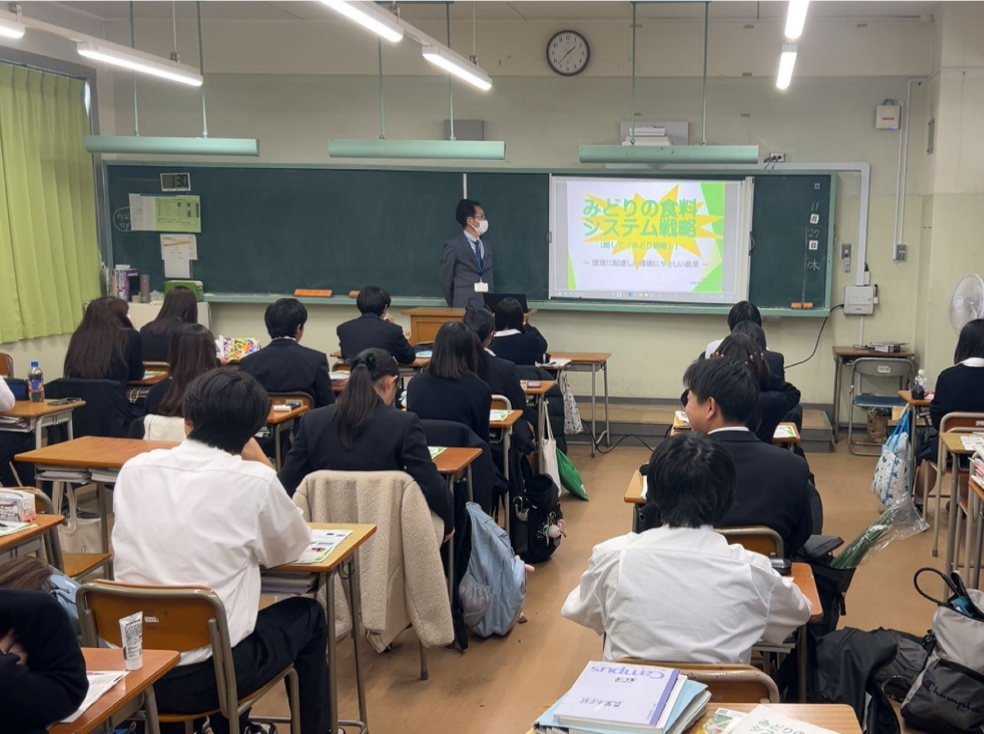 この授業では、日本農業の環境問題や私たちにできる環境への配慮を具体的な事例等を織り交ぜながら説明を行いました。