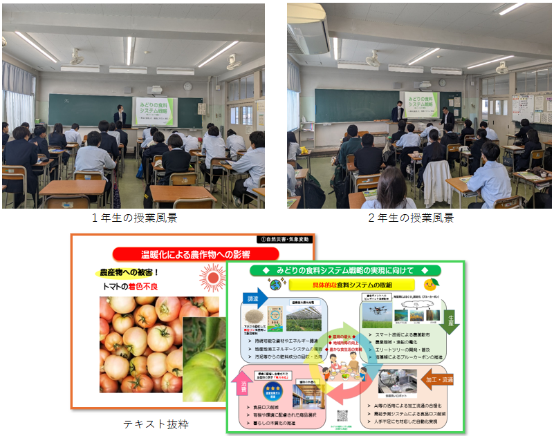 日本の食料と農業について、「我が国の食料自給率」、「日本農業の現状」、「みどりの食料システム戦略」の資料を基に説明をしました。