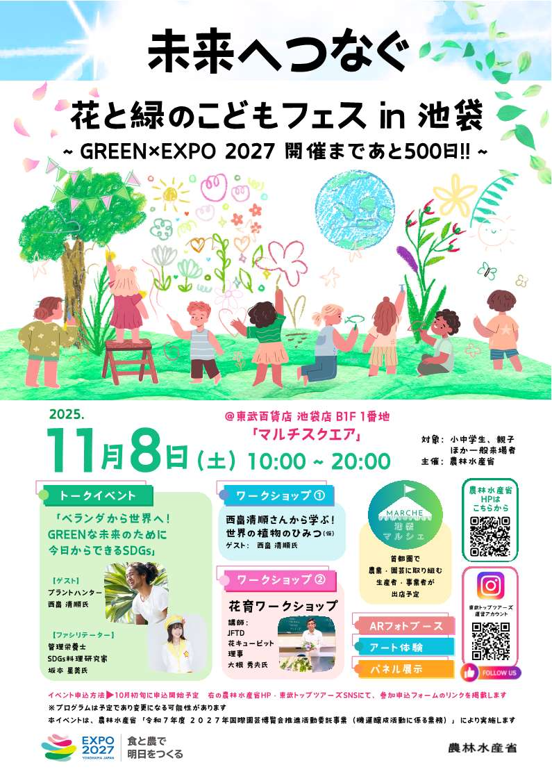 2027年国際園芸博覧会500日前イベント 「未来へつなぐ花と緑のこどもフェス in 池袋」を開催します!:農林水産省