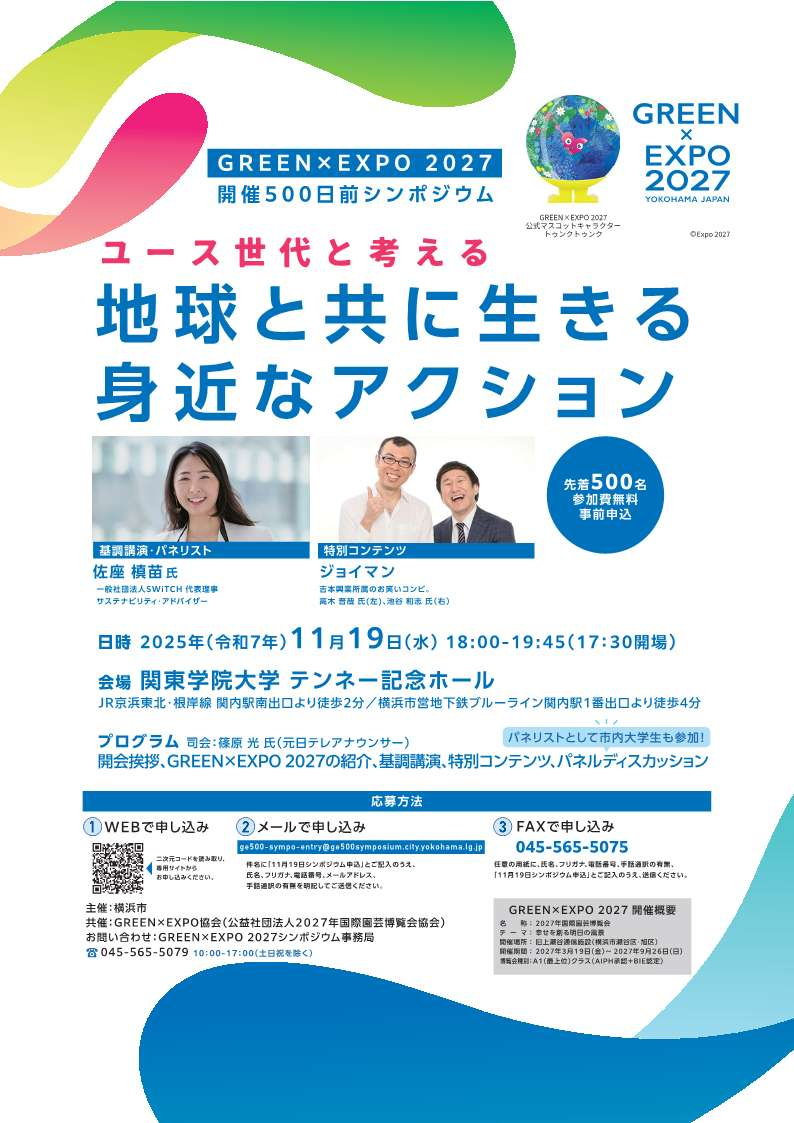 また、11月19日(水曜日)には、関東学院大学 横浜・関内キャンパス テンネー記念ホールにて、横浜市主催の「GREEN×EXPO 2027開催500日前シンポジウム」が開催されます。