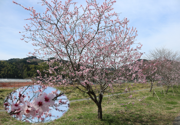 「白ふじの里」周辺の川沿いで、約150本のアーモンドの花が見頃を迎えています。
