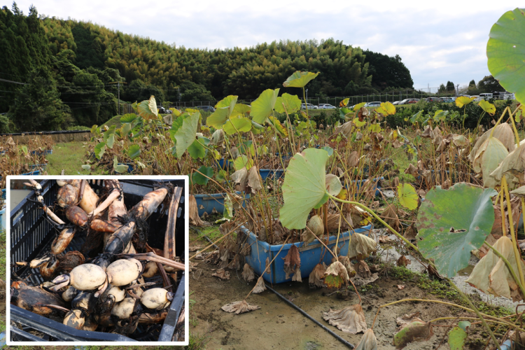 静岡市葵区では全国的にも珍しい「レンコンのコンテナ栽培」が行われており、水圧で容器内の泥を流し出して収穫する光景がみられます。