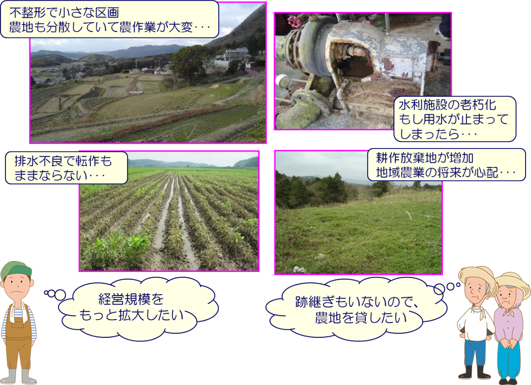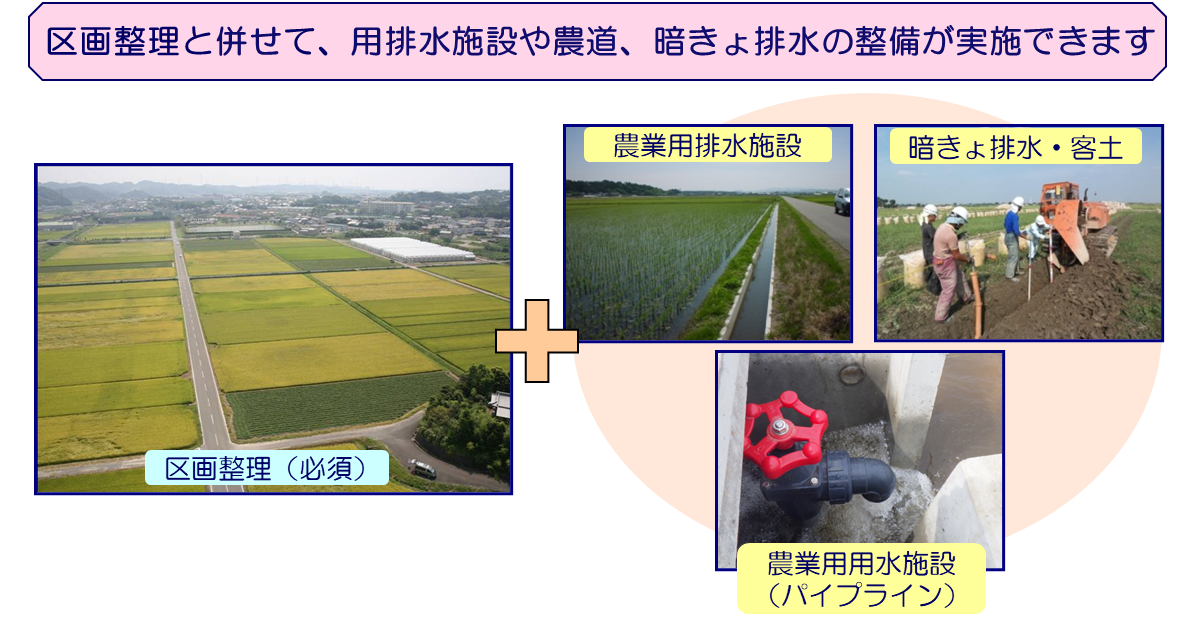 本事業は、小区画、未整備な農地が広がる地域において、広域的な農地の区画整理(大区画化)に併せ、農業用用排水施設、農業用道路、暗渠排水等の整備を行います。耕作放棄地を含めた農地の土地利用を計画的に再編し、担い手への農地の面的拡大(集約化)を進めます。このことにより、生産性の向上と耕作放棄地の解消・発生防止による優良農地の確保を図り、農業の振興を基幹とした総合的な地域の活性化に資することを目的とします。
