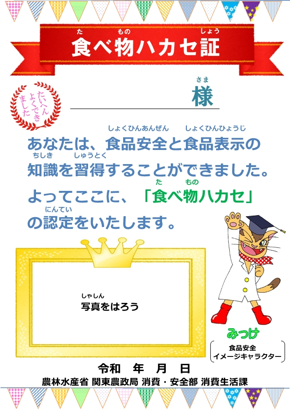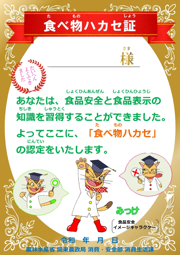 あなたは食品(しょくひん)安全(あんぜん)と食品(しょくひん)表示(ひょうじ)の知識(ちしき)を習(しゅう)得(とく)することができました!