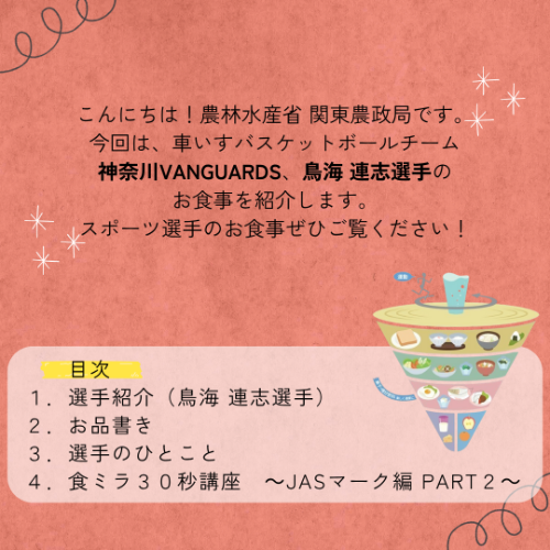 本ページでは食育の一環として、スポーツ選手の食事や様々な施設で提供されている、 栄養バランスが優れた食事や地場産物、旬の食材を活用した食事の紹介をしています。 Vol.21は、神奈川県を本拠地に活動する車いすバスケットボールチーム・神奈川VANGUARDS、鳥海 連志選手のお食事を紹介します。 |