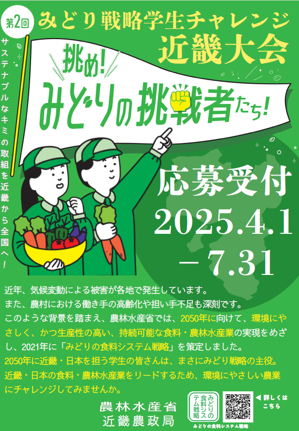 みどり戦略学生チャレンジの地方ブロック大会として、近畿地域(滋賀県、京都府、大阪府、兵庫県、奈良県、和歌山県)の学生の皆さんを対象に、みどりの食料システム戦略に基づく取組の成果を募集し、審査・表彰を行います。また、取組の成果の中で特に優れたものを対象に、全国大会として審査・表彰を行います。
