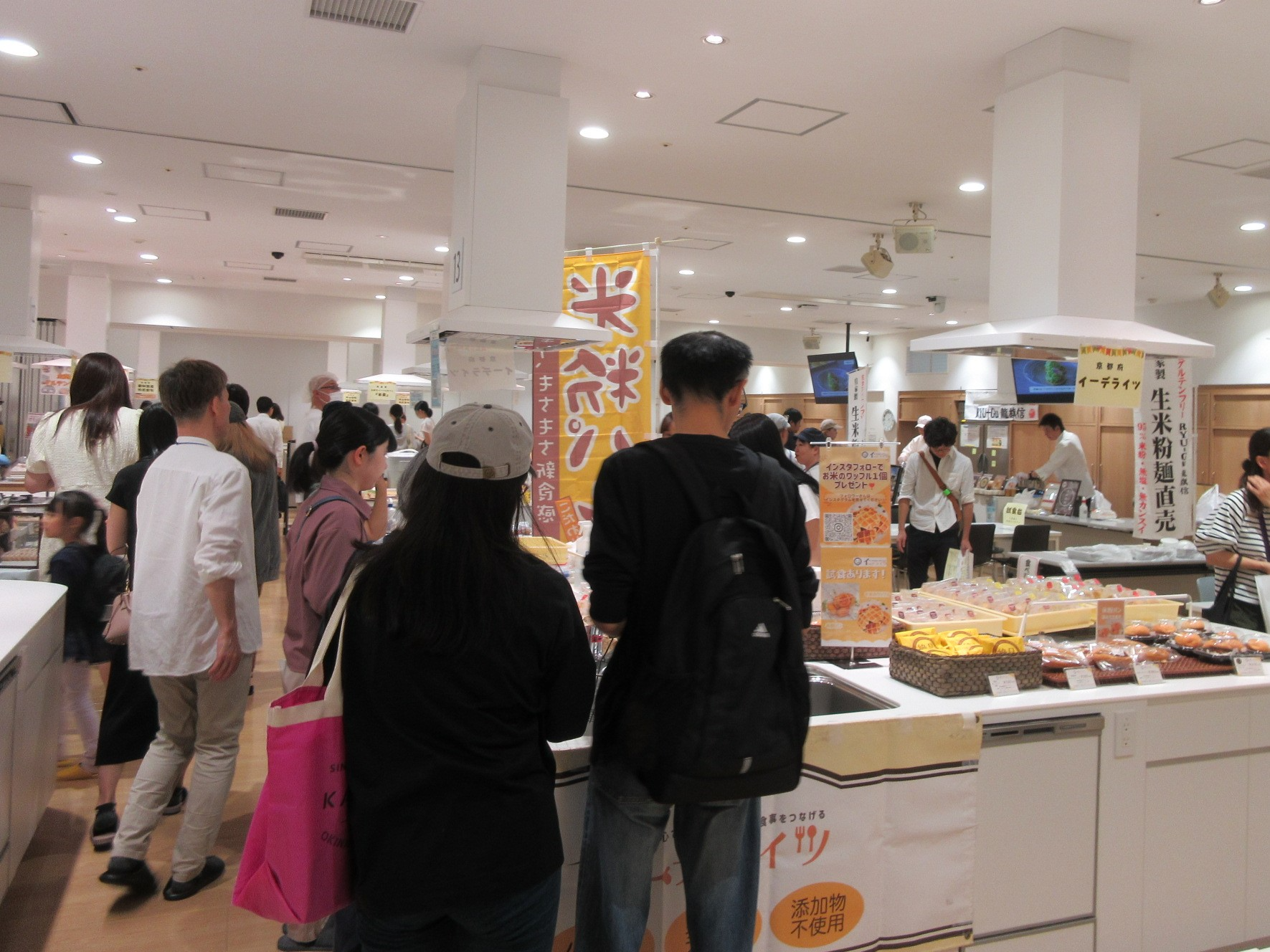 令和7年6月28日(土曜日)、大阪市内において近畿米粉食品普及推進協議会(会長:田村 保氏)の主催により「体験しよう!米と米粉のおいしい関係」をテーマに「米粉フェス2025」を開催しました。同イベントで企画した米粉料理教室では35名、近畿2府4県の米粉商品取扱店舗が出店したフードブースでは392名、計427名の参加者を得ることができました。料理教室では、近畿米粉食品普及推進協議会副会長で一般社団法人キッズキッチン協会副会長の坂本佳奈氏より「米粉マエストロになろう!」をテーマに米粉料理のレシピが紹介されました。第1部では人気のベイキング料理4種類、第2部ではエスニック料理5種類が紹介され、各部の参加者はそれぞれ2種類を調理体験しました。参加者からは、「どれも美味しかった。特にピザを家で作りたい。」、「スノーボールがサクサクしていて、美味しかった。」等の感想が寄せられました。近畿2府4県の米粉商品取扱店舗14店が集合したフードブースでは、試食と物販を行いました。参加者からは「米を大切にされているのが伝わる企業が多く、どの店舗もとても良かった。」、「各地でこのようなイベントがあればいいと思う」等の感想が寄せられました。