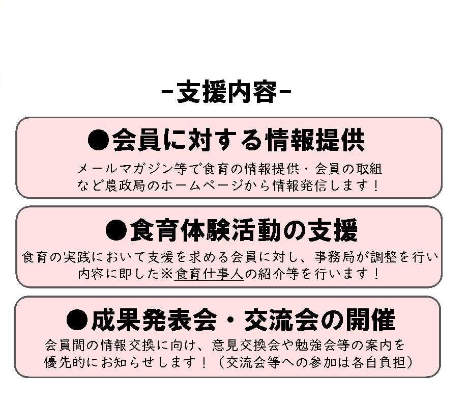会員の皆様の貴重なご意見をいただきながら、「未来につなぐ食育倶楽部」を育てていきたいと考えております。