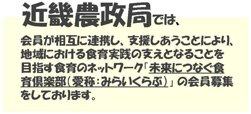 食育の実践を進めていく上での悩みに応えるためのシステムとして、平成23年に近畿地域の食育ネットワーク「未来につなぐ食育倶楽部」を設立しました。