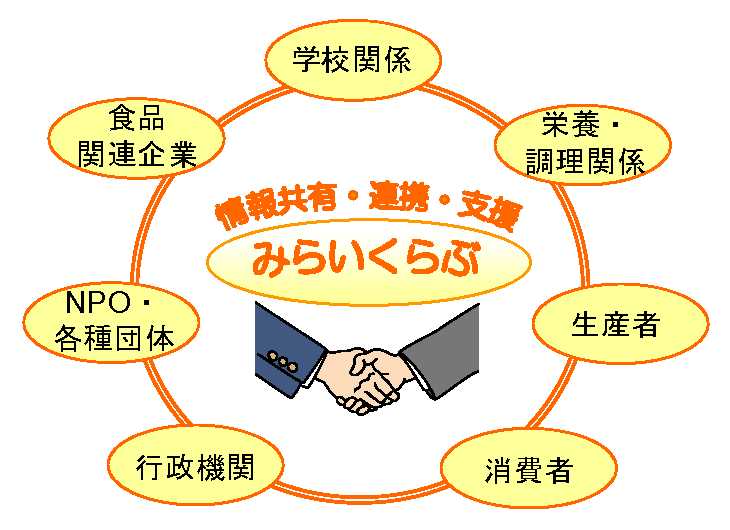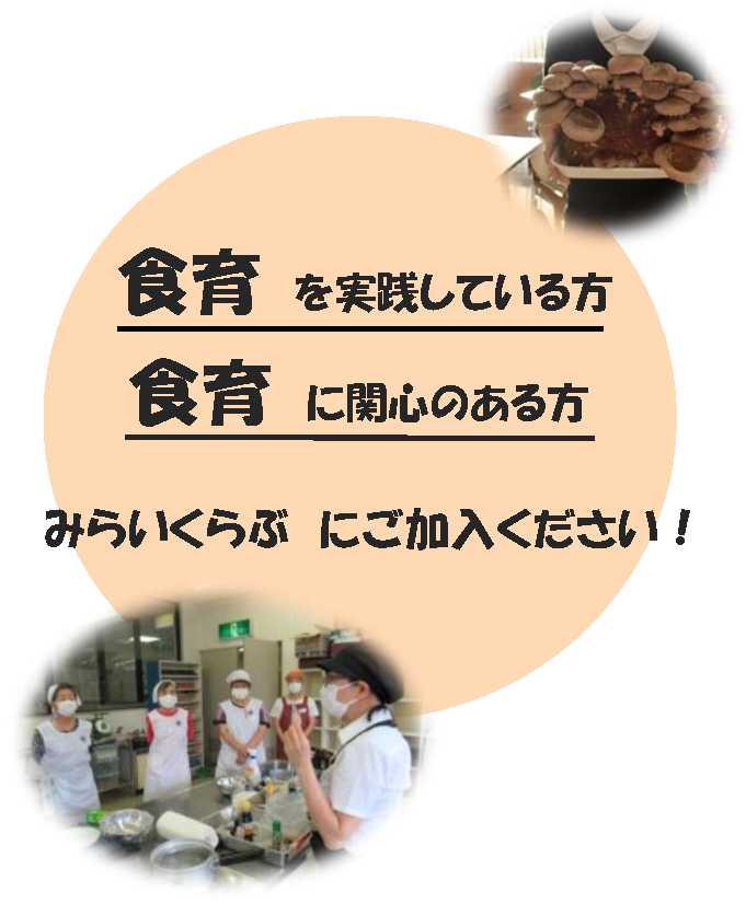 「未来につなぐ食育倶楽部」は参加する会員が相互に連携し、支援し合うことにより、地域における食育実践の支えとなることを目指す、会員みんなで育てていくネットワークで、愛称をみらいくらぶといいます。