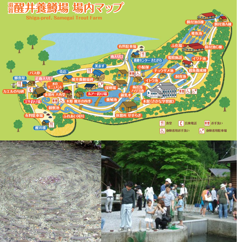 明治11(1878)年創立。琵琶湖の固有種ビワマスなどの養殖を目的とした 日本最古級の養鱒場。場内の大小の池にニジマスを始めイワナ、アマゴ、 ビワマスが群泳。 湧水を水源とする清流のせせらぎが心地よい名勝「醒井渓谷」に位置し、 夏に訪れるのに最適です。 人気の「エサ釣り場」では釣れたニジマスを塩焼きにして味わえます。 楽しいエサやり体験のほかに、魚と遊べる「ふれあい河川」や水槽展示の ある「さかな学習館」、マス料理店などもあります。