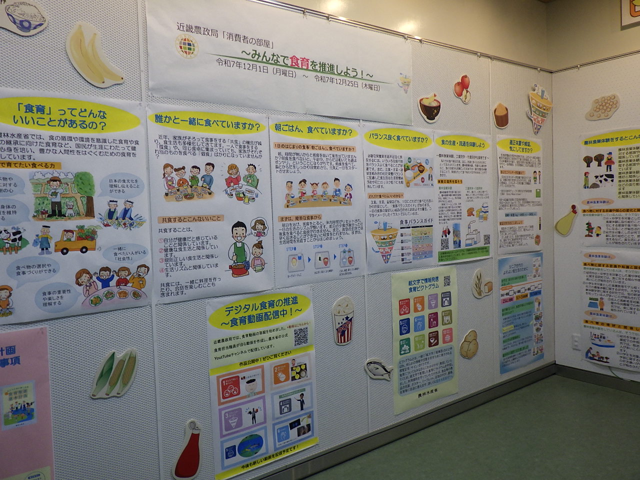 近畿農政局では、消費者をはじめとした国民の皆様に情報を提供するため「消費者の部屋」を開設し、この場を活用して身近な食生活や、農林水産省の取組などをテーマとする展示を行っています。
