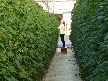 茎が高くまで成長しているため、従業員の方も台の上で作業を行っています。 |