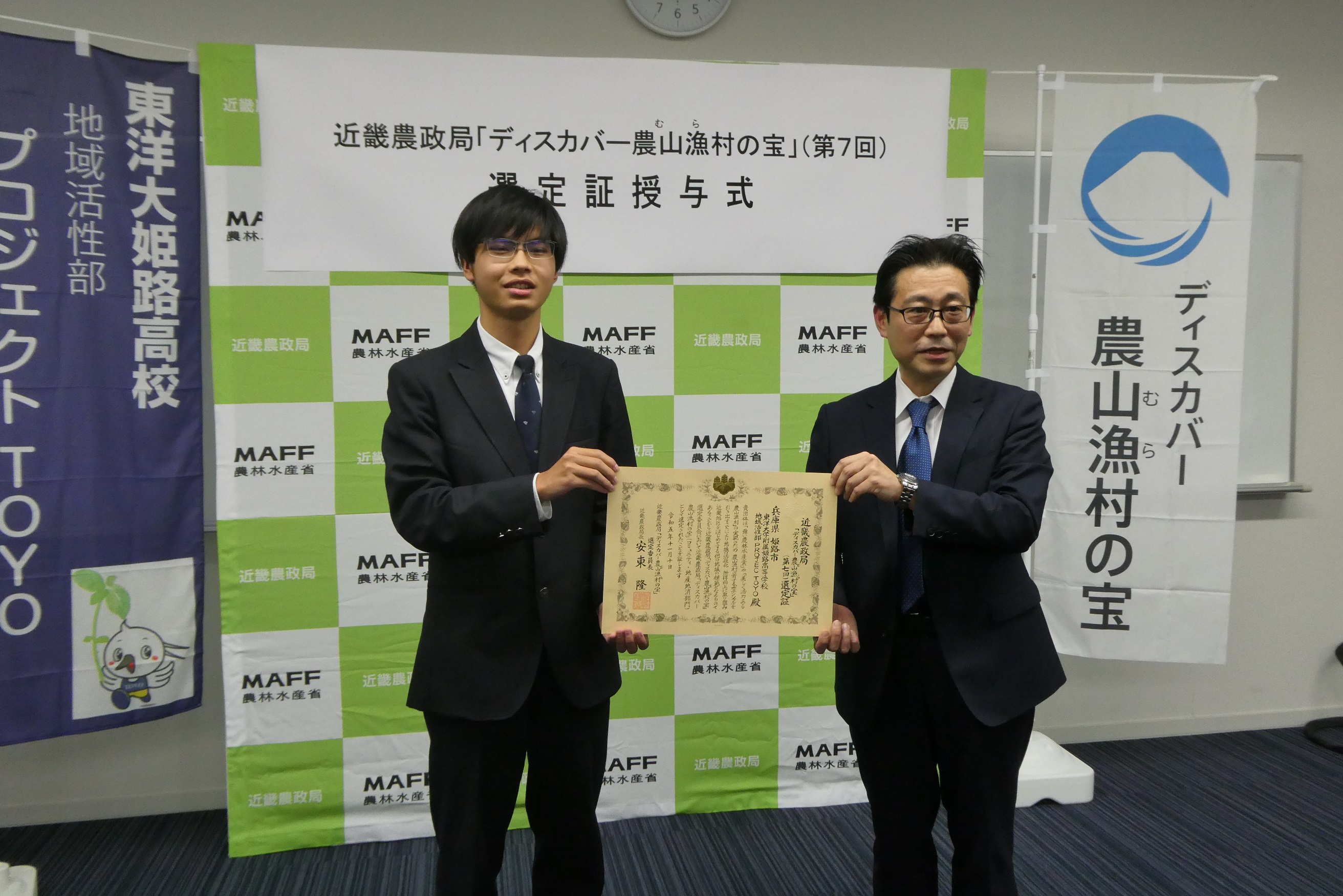 近畿農政局「ディスカバー農山漁村(むら)の宝」(第7回)選定証授与式を開催しました(東洋大学附属姫路高等学校)