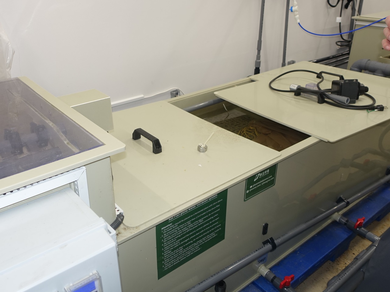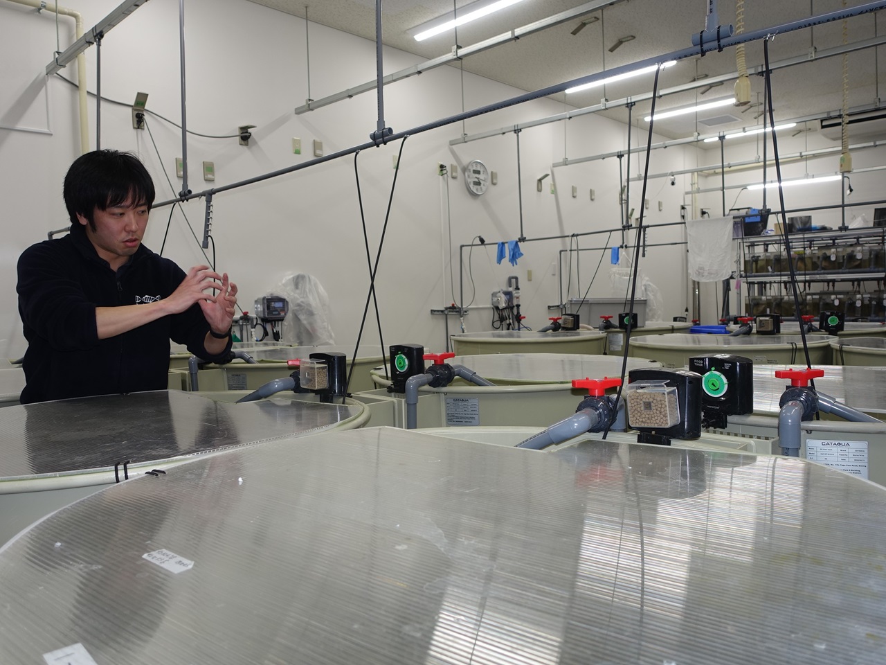 研究施設の閉鎖循環方式のろ過装置では、微生物による水質浄化、商用運用している養殖施設では、掛け流し方式を採用し黒字化を達成しています。