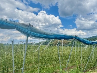 平成27年から地域をあげた栽培が始まった与謝野町ホップですが、農家の人材不足や高齢化、コロナ禍の影響等により、最盛期には2tを誇った生産量が現在は4分の1にまで減少しています。この危機的状況を受け、同社では与謝野ホップの自社栽培を始めました。与謝野町で栽培されているホップ11品種のうち、コロンバス、カスケード及びチヌークの3品種を栽培しています。