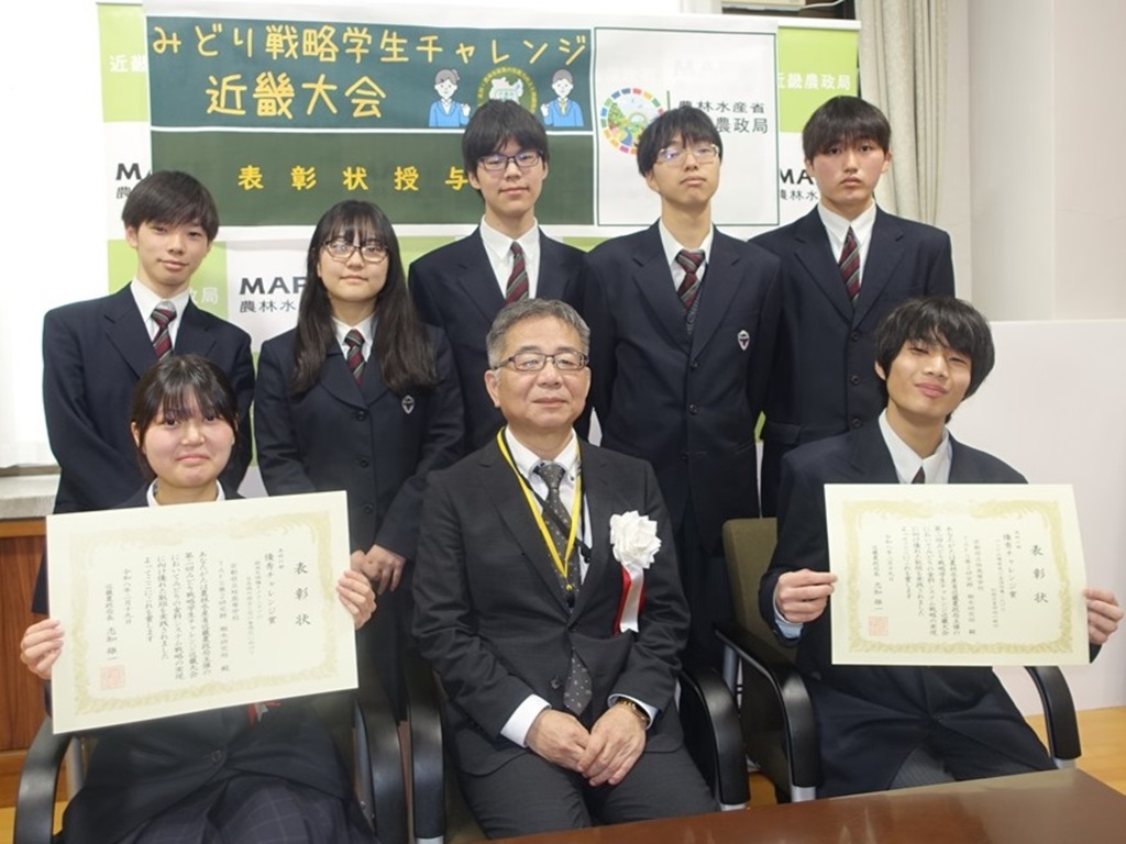 近畿農政局特別賞及び、優秀チャレンジ賞を受賞された京都府立農芸高等学校を訪問し、吉田地方参事官より表彰状の授与を行いました。