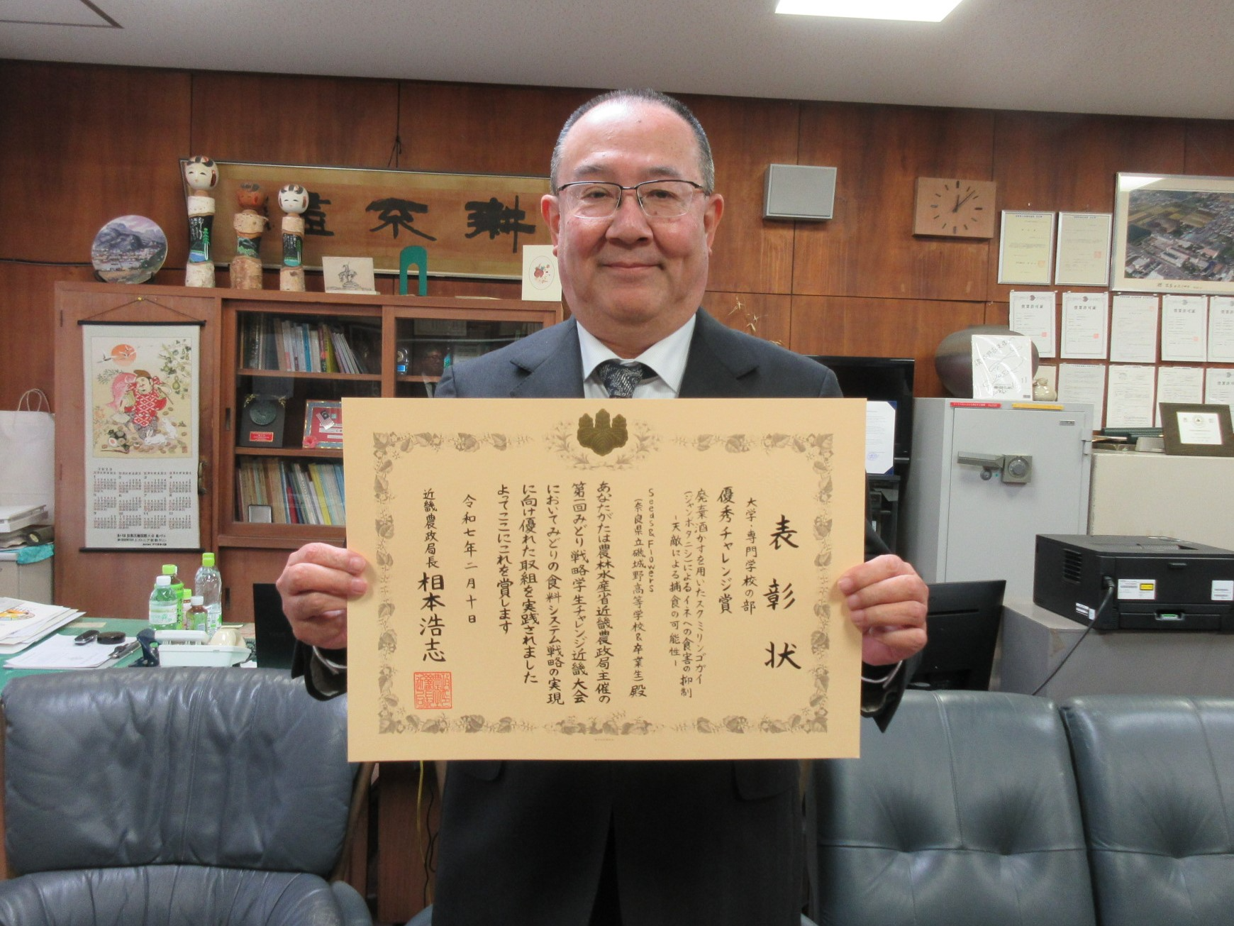 今般、近畿農政局管内から応募のあった47 件(高校の部:25 件、大学・専門学校の部:22 件)の学校・グループの中から審査委員による審査を経て表彰事例が決定され、近畿畿農政局奈良県拠点は、奈良県内の受賞校の代表者に表彰状を授与しました。