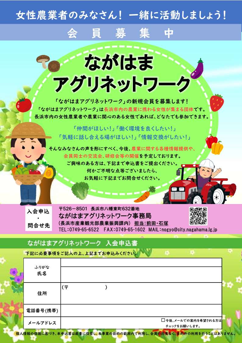 最後に「ながはまアグリネットワーク」では随時会員を募集しています。長浜市に在住の女性で農業に関心のある方が対象です。ご興味のある方は事務局までお問い合わせください。 |