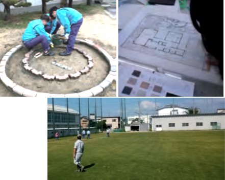 地域の歴史や自然を活用し、花と緑に彩 られた暮らし・街づくりに取り組みます。 写真 左上:卒業製作造園(造園技術) 右上:庭園の製図(ランドスケープデザ イン) 下 :天然芝の校庭(環境緑化 材料)