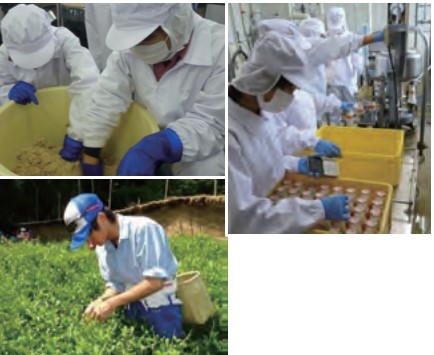 食材生産や加工品の製造・販売に加え、食品成分の知識や分析について学びます。 写真 左上:味噌の製造(農産加工) 右 :牛乳の製造(畜産加工) 左下:政所茶の茶摘み(流通科学)