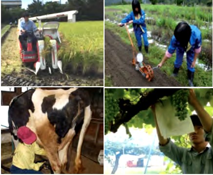 農業の基本的な知識・技能の習得に加 え、自ら栽培した農畜産 物の販売や商品開発に取り組みます。 写真 左上:イネ収穫(作物・機械) 右上:野菜の播種(野菜) 左下:乳用牛の飼育(畜産) 右下:ブドウの栽培(園芸)