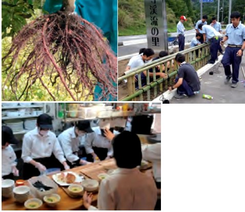 地域とのコラボプロジェクト、始動中! 同校では、就農を視野に入学する生徒は一部で、多くの生徒は「興味がある」「面白そう」といった動機で入学するそうです。また、地元志向が強く、多くの生徒は地元へ進学・就職するそうです。 そこで、生徒に農業の魅力を伝えるため、学科ごとに地域と連携したプロジェクトやインターンシップ、生徒が親近感を持てるよう、地域の若手農業者や女性農業者による講義などを行っています。 写真 左上:(農業科)東近江市の花「ムラサキ」の栽培・普及 左下:(食品科)地産地消がテーマの「八南レストラン」 右上:(花緑デザイン科)地域施設の前庭製作