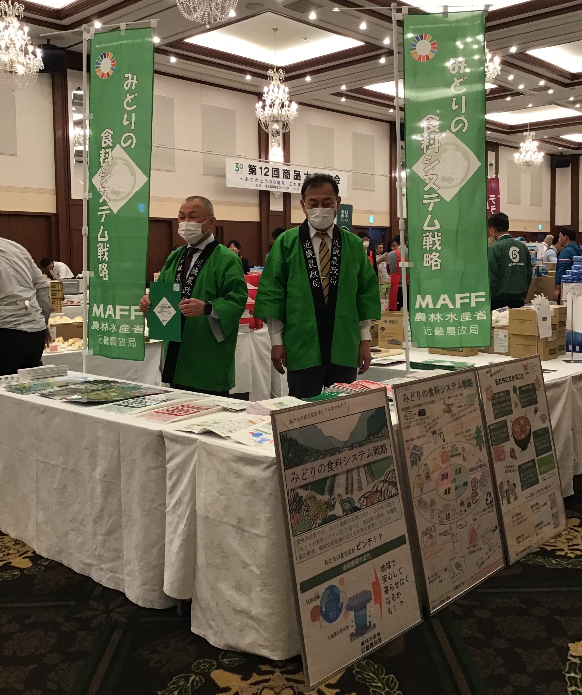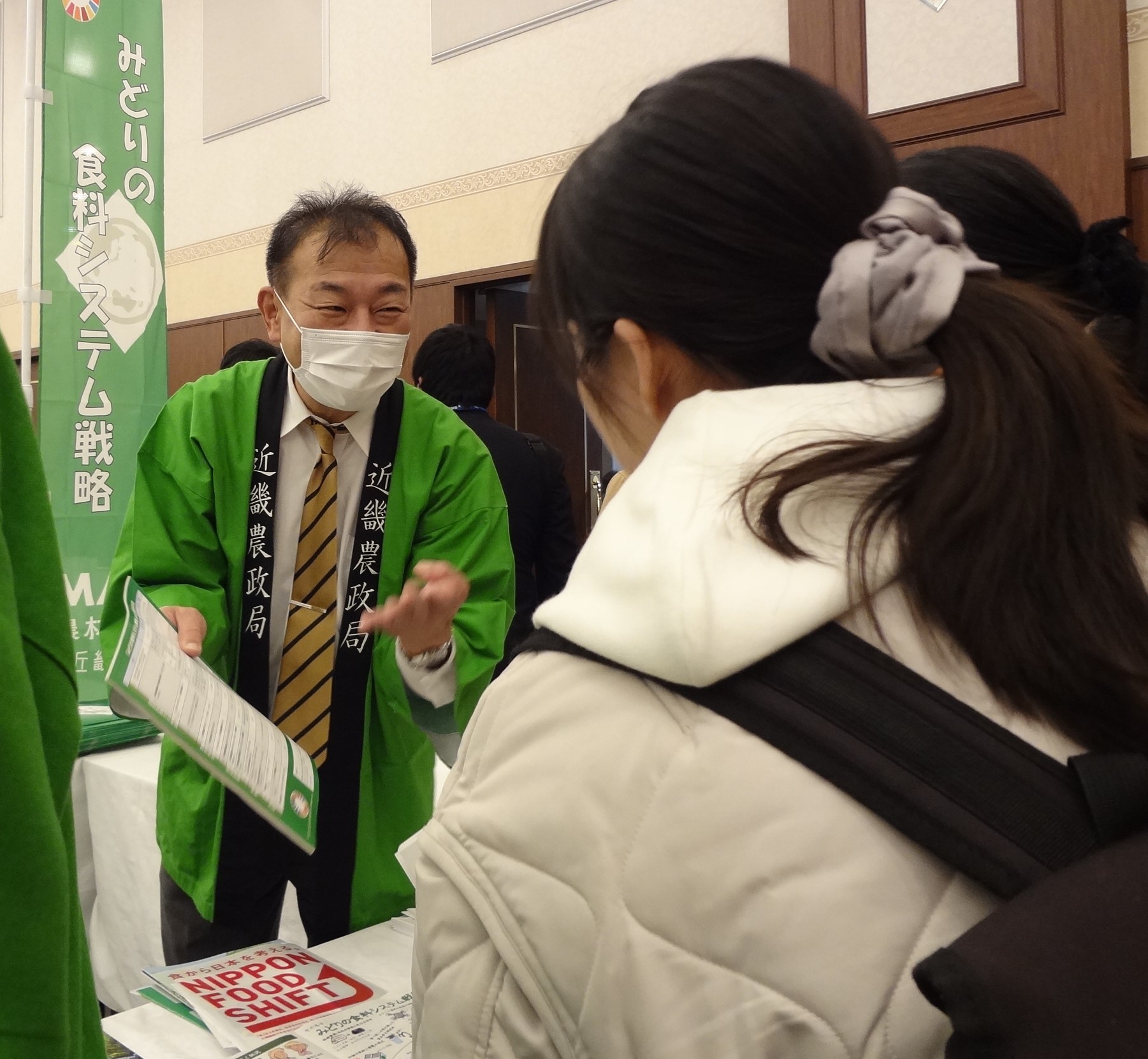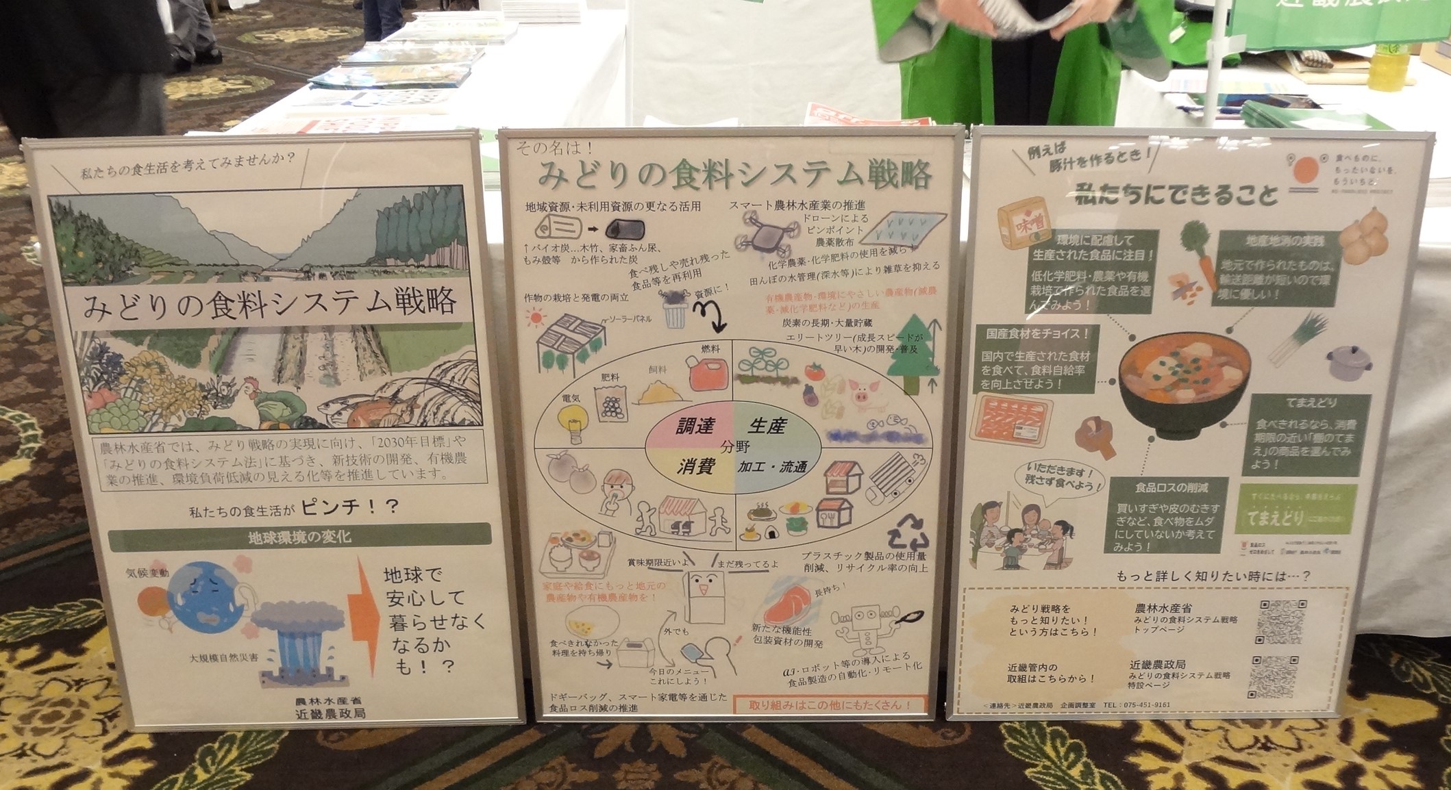 滋賀県拠点のブースでは、みどりの食料システム戦略(以下「みどり戦略」という。)のパネル展示を行うほか、子供でもみどり戦略を楽しく学べる「すごろく」のついた近畿農政局作成のパンフレットなどを配布し、みどり戦略等をPRしました。