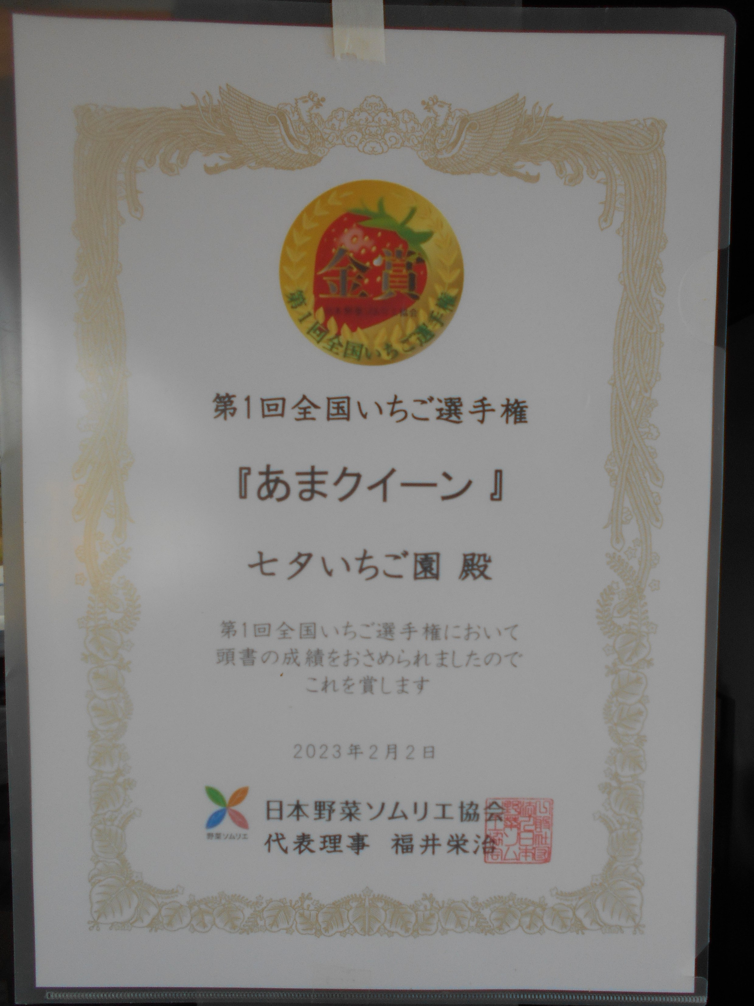 全国いちご選手権 金賞受賞 米原市の天候は曇りが多いため、成長は遅く収穫量も少なくなりますが、その分糖度が高いイチゴができるとのことです。令和5年2月に開催された第1回全国いちご選手権では、「あまクイーン」の品種で金賞を受賞されました。 |