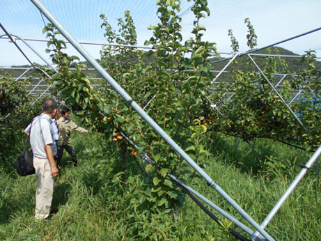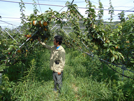 なしのジョイントV字トレリス型栽培 なしの栽培方法については、農業大学校時代に先生や同級生のなし農家から指導を受け、また、神奈川県や鳥取県など生産地の視察や研究資料から情報を収集されました。 水原さんの栽培方法は、主枝を隣の主枝に接ぎ木することで早期多収性効果があるジョイント栽培と果樹棚をV字型に設置することで作業姿勢が楽になり、機械導入にも対応できるV字樹形栽培を組み合わせたもので、当時、滋賀県では初めての導入だったそうです。