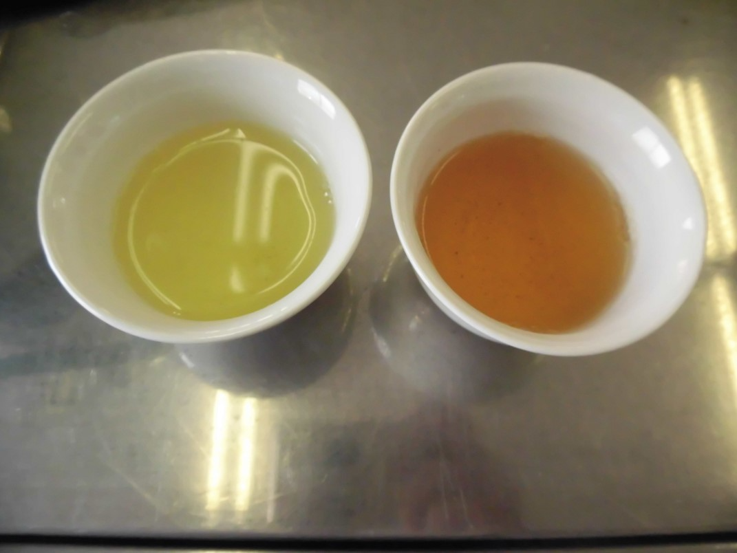 できたお茶を飲み比べて、児童は「煎茶はあまい香りがする」「ほうじ茶は少し苦くておいしかった」との感想を述べていました。