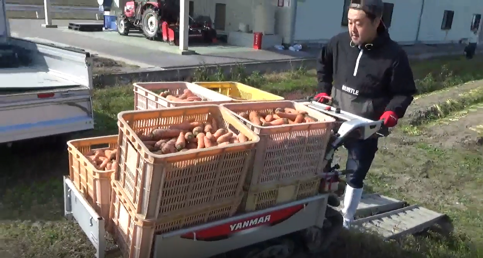 ![]() 収穫したにんじんは、葉と先端にある細い根を切り取り、コンテナに入れて運搬機へ。 |