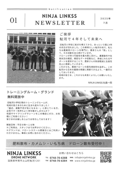 株式会社NINJA LINKSSは甲賀市土山町の旧鮎河小学校(以下「旧校舎」という。)を拠点に、農業用ドローンに係る、ドローンスクール事業、ドローン散布受託事業、ドローン販売とメンテナンス事業を主に展開しています。フランチャイズ方式により全国100拠点以上と連携(LINKSS)しており、特約店へのサポートの向上により、全国の農業者の支えとなるよう奮闘しています。