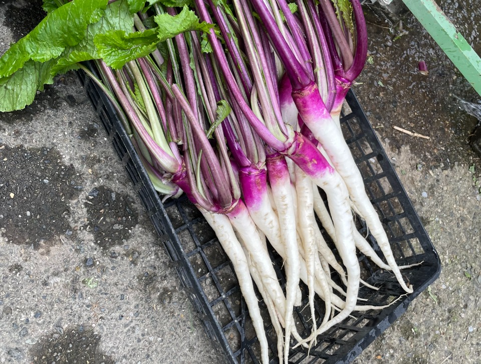 明治以降に品種改良が行われ、根は太さ2~3センチ、長さ30センチ前後で鮮やかな赤紫色と真っすぐに伸びた白い根とのコントラストが美しく、独特のえぐみと風味、パリッとした食感が特徴となっています。