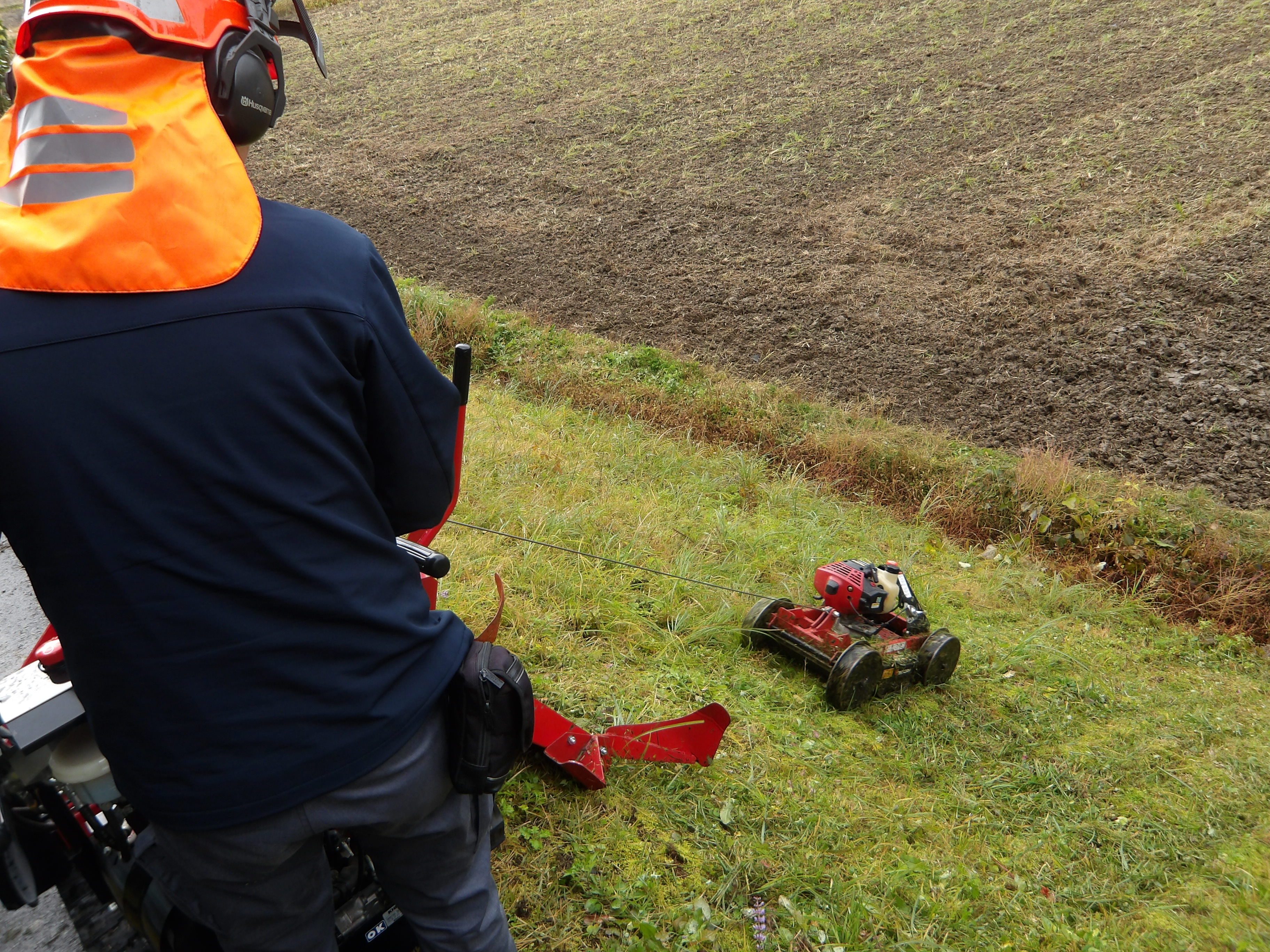 急斜面での草刈作業はかなりの労力がかかる上、大きな危険が伴います。研修会に参加された方は、急斜面での草刈機の予想以上の作業スピードに驚かれていました。またスピードだけでなく、子機がひっくり返った場合は「刈刃停止ボタンが自動で押される」等の安全面にも配慮された設計となっており、操作も簡単で身体的負担も少なく、今後の草刈作業の見直しをするための参考になったとの感想がありました。