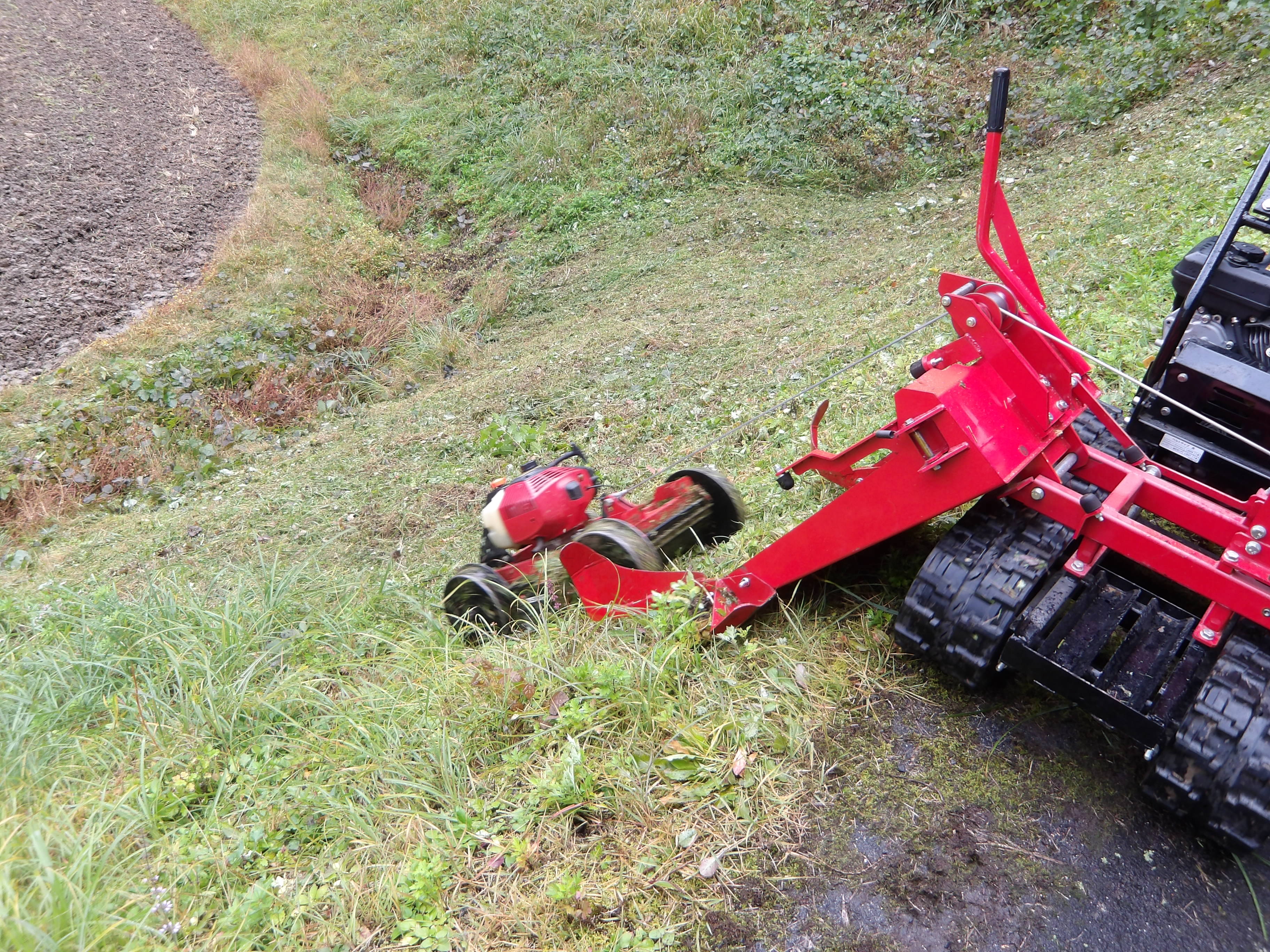 斜面の角度と自身の重さで勢いよく草を刈る様子