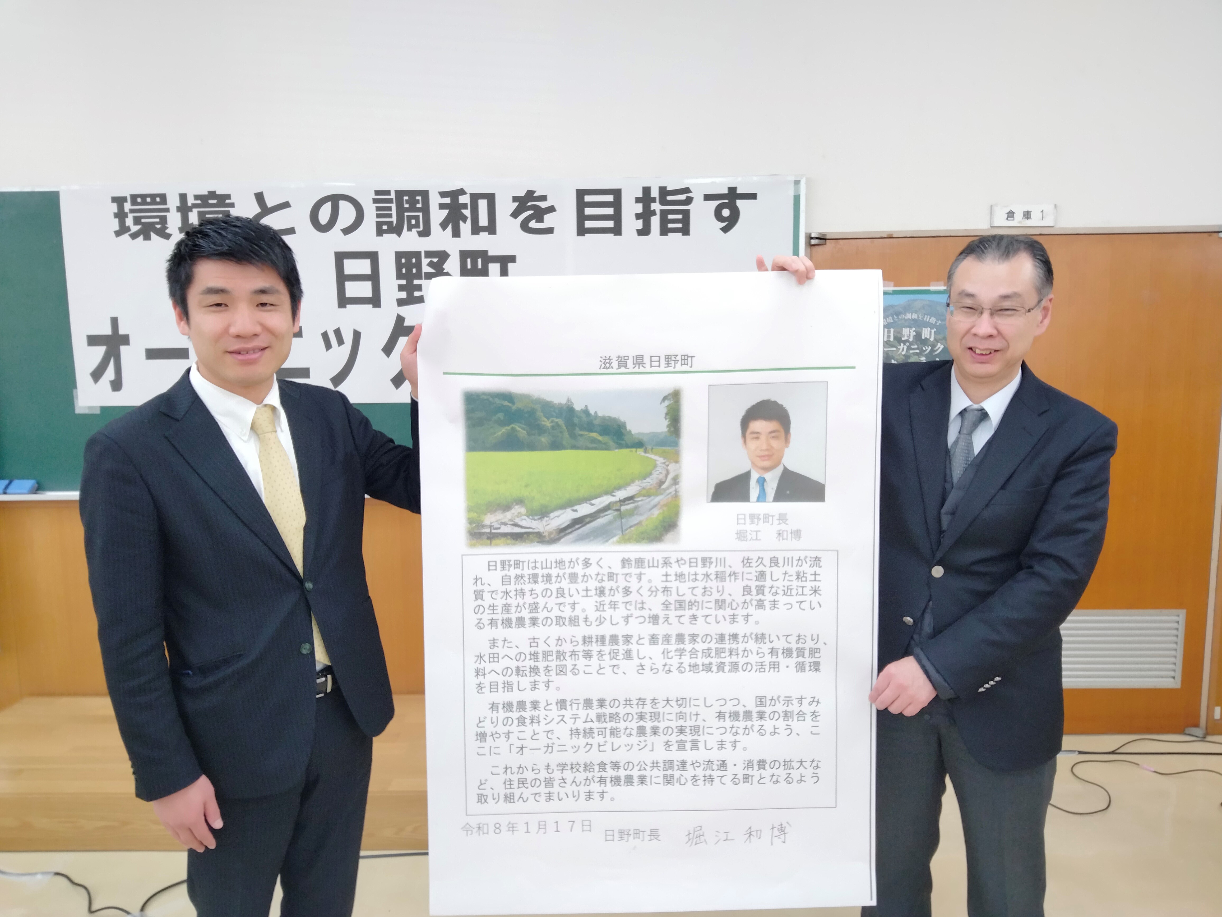 令和8年1月17日、日野町主催の「環境との調和を目指す日野町オーガニック・フォーラム」が日野町林業センターホールで開催されました。会場には、関係機関を含めて約60名の参加者が集まりました。