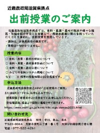 | 滋賀県拠点では、食料・農業・農村の現状や様々な施策・取組を紹介することを通じ、農林水産業に関心を持っていただくことを目的に、出前授業を実施しています。 |