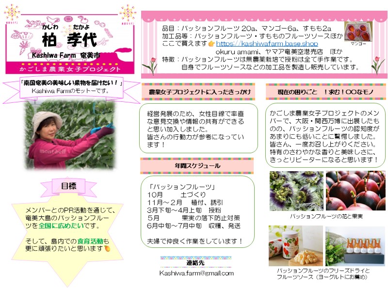 かごしま農業女子プロジェクトメンバーの紹介vol.17「柏孝代さん」今回は、奄美市で、パッションフルーツやマンゴーなどを栽培しているKashiwa Farmの柏孝代さん。