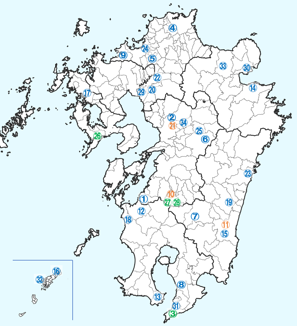 ※表示の色はそれぞれ、 農福連携整備事業+農福連携支援事業 農福連携支援事業のみ 人材育成支援事業※位置図の番号は、採択団体の番号とリンクしています。