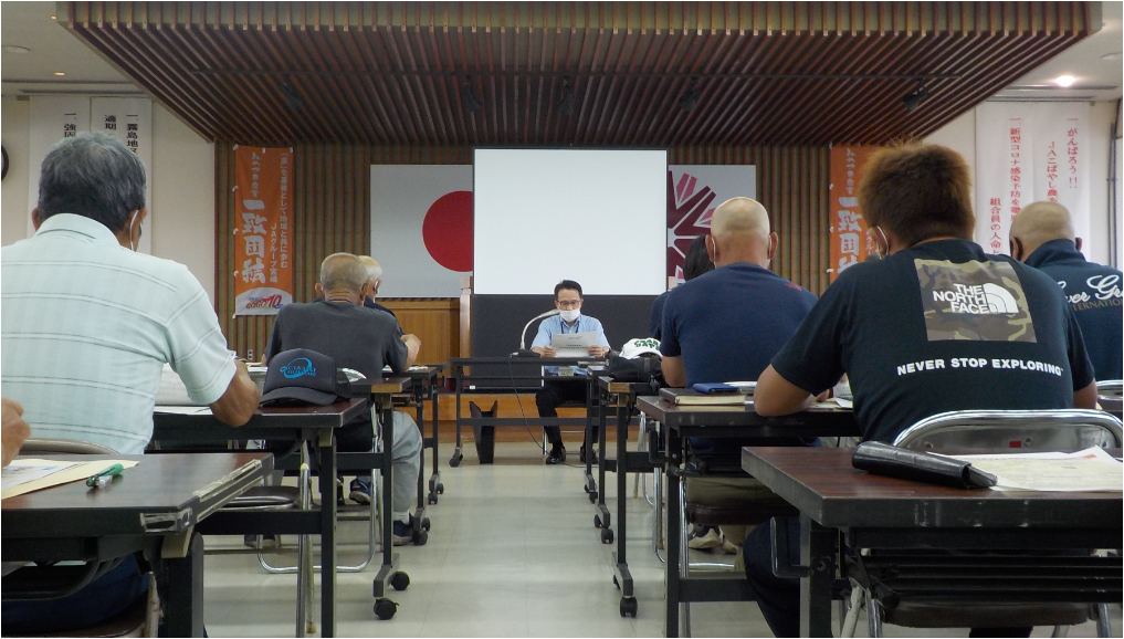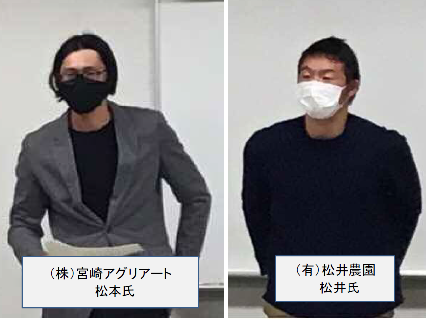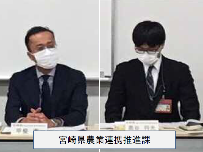 また、宮崎県農業連携推進課、宮崎県農業法人経営者協会及び有機農業に取組む業者(2社)を招き、宮崎県からは「宮崎県有機農業連絡協議会」の取組みを、(株)宮崎アグリアートからは、有機農業でのドリフト対策、農地集積等、また、(有)松井農園からは、コロナ禍でのご苦労や販売方法で工夫している点などを紹介していただきました。