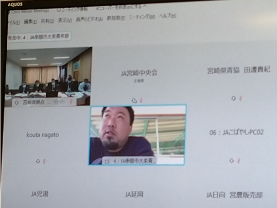 宮崎県拠点としては初となるJA宮崎県農青協の役員の方(県内14カ所)を結んだオンラインによる意見交換会を開催しました。冒頭、田邊貴紀委員長から、高収益作物次期作支援交付金の運用見直しに伴うJA宮崎県農青協の要請に際し、拠点の真摯な対応について感謝の言葉をいただくとともに、今後はより一層、オンライン等を活用した、農政局との情報交換や現場の実態を共有することで、今後の農政に活かしてもらいたいとのご意見をいただきました。