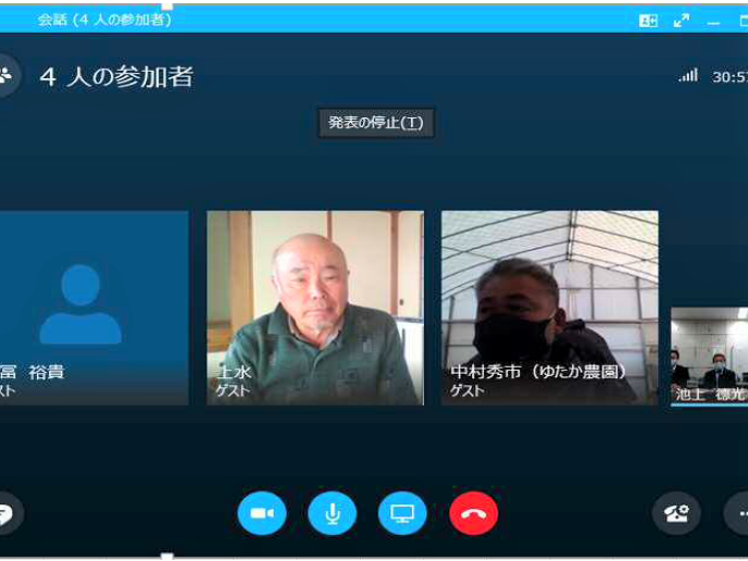 北諸県地区の農業者(3名)と農地集積の現状や課題等について、オンライン形式『自宅、ハウス、出張先(広島)、拠点を結んだ4元中継』による意見交換を行いました。地域における後継者・パート人材不足や、農政情報は市役所やJAから広報されるが、時間がかかり量も限られている。いかにタイムリーに伝達するかなどについて意見交換が出来ました。参加者からは、「コロナ禍の中、直接の訪問が難しいのでオンライン方式は経費や時間の制約も少なく、良い試みである」との評価をいただきました。