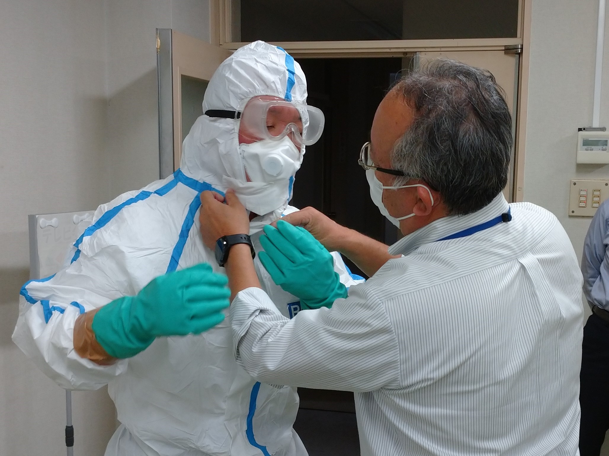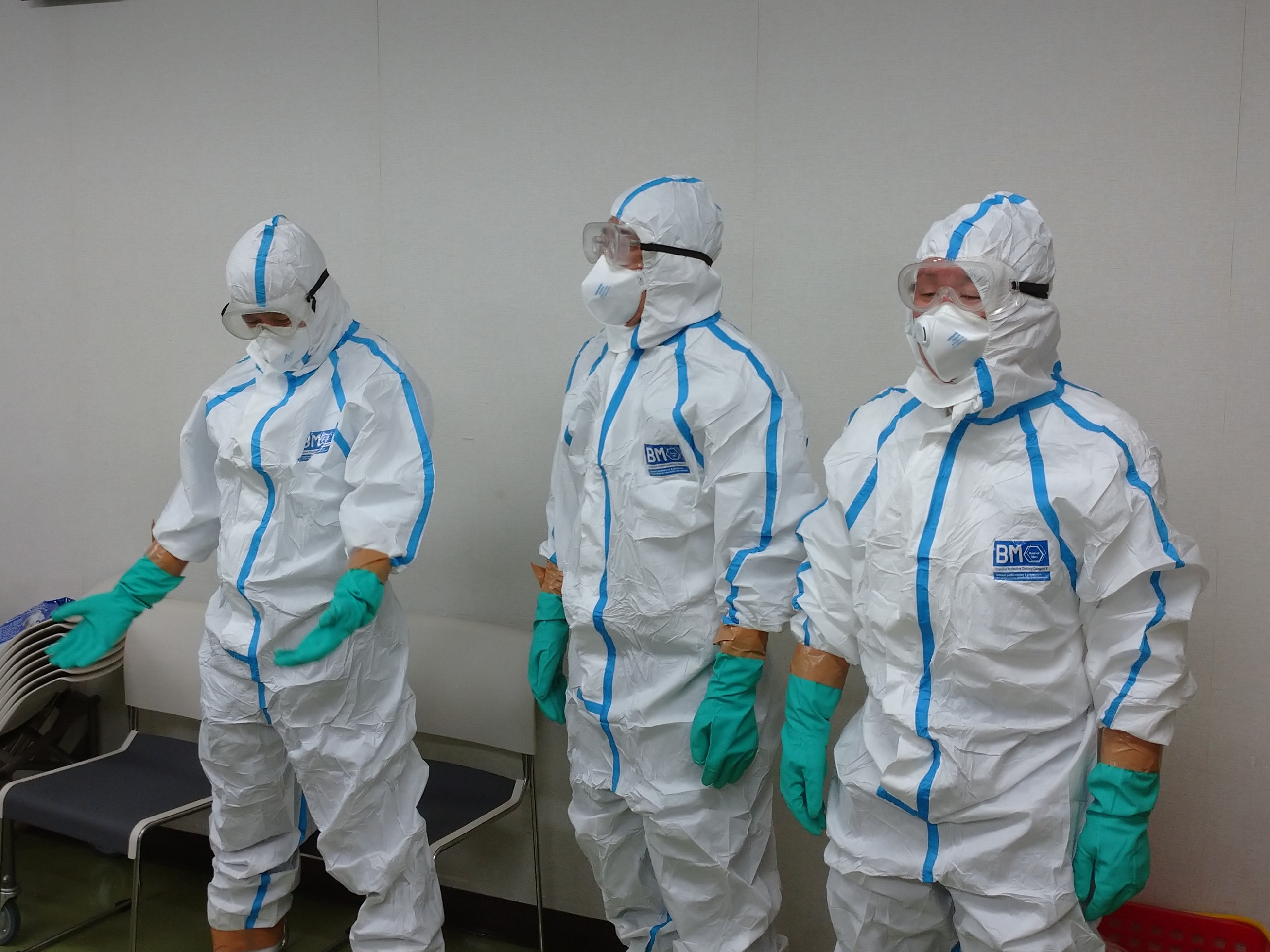 (訓練)県からの第1報を受け、拠点対策本部を立ち上げるとともに、県対策本部へのリエゾン派遣及び関係者への情報共有方法や農場防疫作業者等の人選までを机上演習するとともに、防護服等の着脱訓練を行いました。