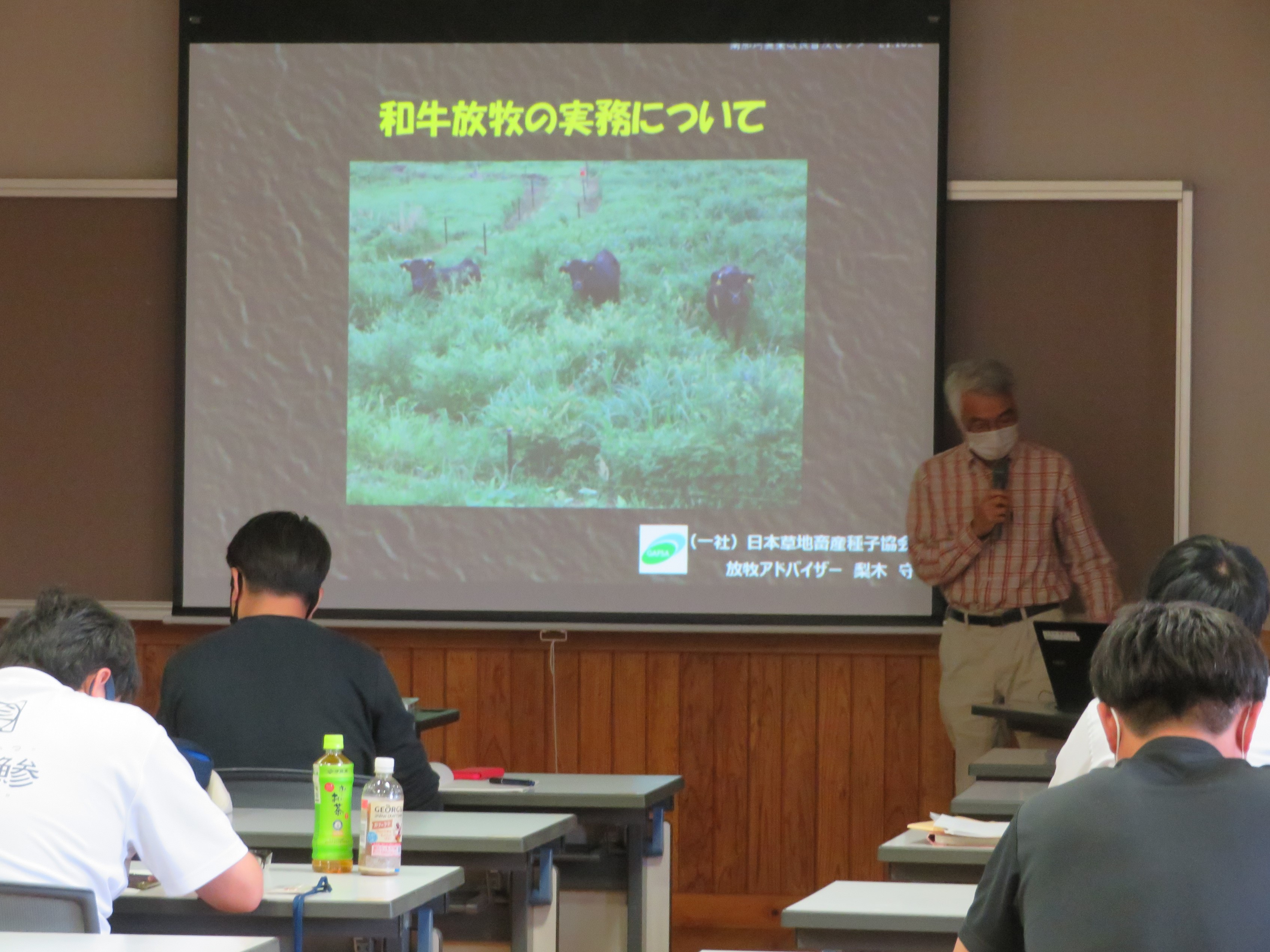 放牧を希望する延岡市、日向市及び東臼杵郡内の和牛生産農家と関係機関担当者の30名が参加し、東臼杵郡門川町で放牧に取り組んでいる和牛繁殖農家の放牧場の現地視察と日本草地畜産種子協会の放牧アドバイザーによる座学研修(東臼杵北部農業改良普及センター)が行われました。放牧で必要となる放牧場及び草地造成の基本的な手順や留意点等に関する研修が行われ、参加者は熱心に話しを聴いていました。宮崎県内においても放牧への関心が高まっており、宮崎県畜産協会では、本年度、県内4か所で研修会を開催する計画で、次回は7月28日に児湯地域で行われる予定です。
