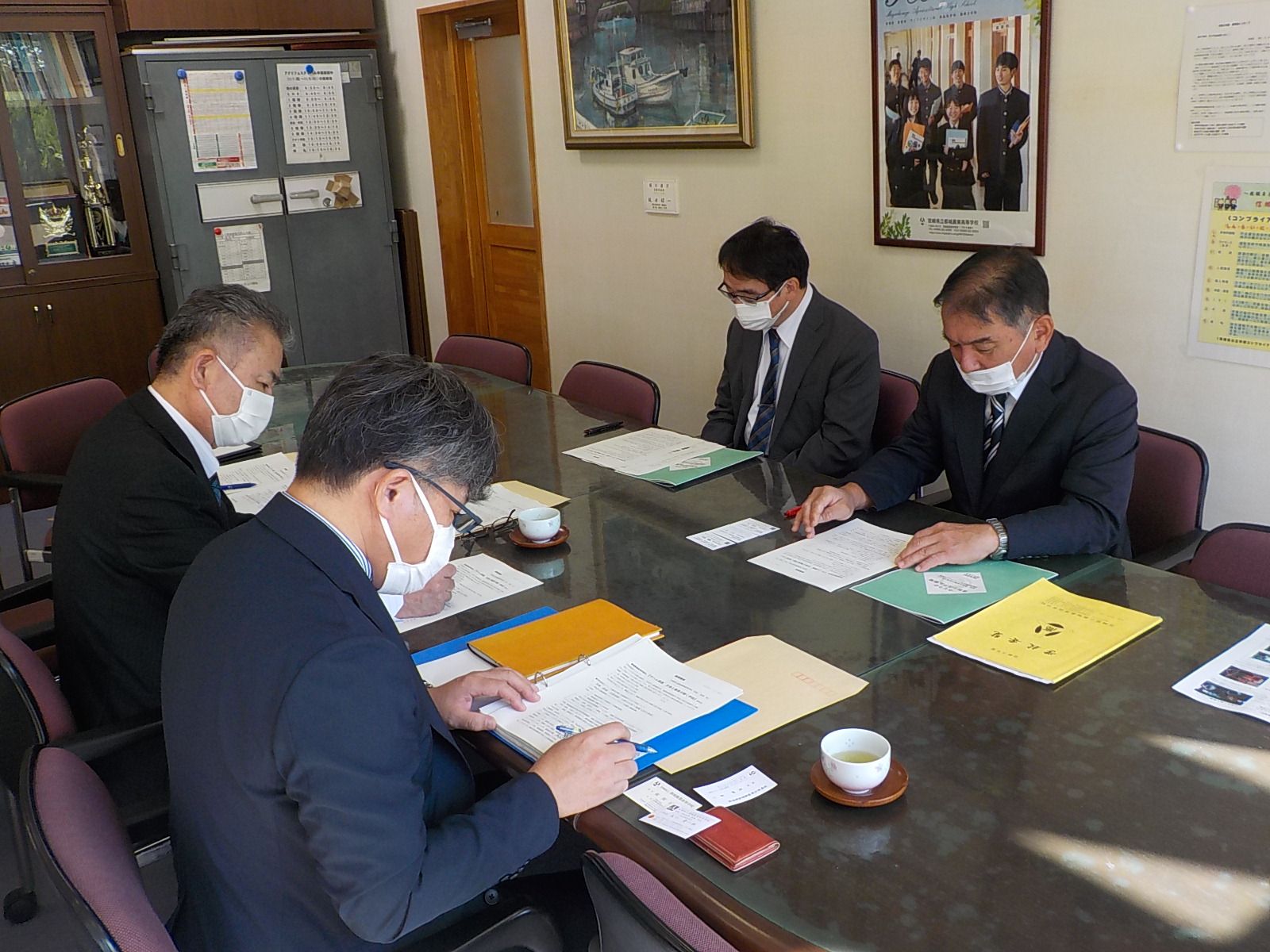 宮崎県立都城農業高等学校を訪問し、校長先生、教頭先生と意見交換を行いました。意見交換では、「みやざき(都城)の明日を担う地域人材育成」に向けたデュアルシステムの取組(学びながら働く、働きながら学ぶのキャリヤ教育)などの同校の取組について説明していただき、卒業生の進路状況、スマート農業やGAPの取組、最近の農業高校を取りまく状況等について意見交換を行いました。宮崎県拠点からは、みどりの食料システム戦略や新規就農者への支援策等について説明し、引き続き就農に向けた取組について情報共有を図っていくことといたしました。